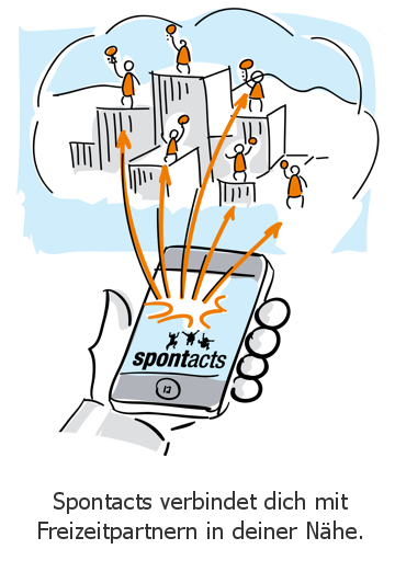 Spontacts verbindet Menschen an Orten und mit Events. Die Software sortiert automatisch nach Interessen und Einzugsgebiet. Trotz der Automatisierung findet ohne Eigeninitiative aber noch gar nichts statt: «Wenn mir ein Anlass gefällt oder einfällt, kreiere ich per Knopfdruck eine Aktivität und lade entweder nur Freunde ein, oder ich mache daraus einen öffentlichen Anlass, den alle Interessierten in der Umgebung per Nachricht auf ihr Handy erhalten», sagt Seitz. Alle Spontacts-Nutzer können per Knopfdruck nach Aktivitäten in ihrer Umgebung suchen und sich dazu anmelden. Die angemeldeten Personen chatten in den anlassspezifisch getrennten Chaträumen miteinander, beispielsweise um Fahrgemeinschaften zu bilden.